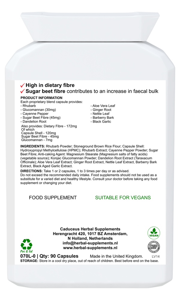 Ingrediënten: Rabarberpoeder; Capsule: Hydroxypropylmethylcellulose (HPMC) (vegetarisch) (125 mg); Glucomannan poeder; Cayennepoeder; Rabarber extract; Suikerbietvezel; Antiklontermiddel: Magnesiumstearaat (plantaardige bron); Paardebloemwortelextract; Aloë Vera Leaf Extract; Gemberwortelextract; Brandnetel Extract; Berberis Extract; Zwart verouderd knoflookextract.