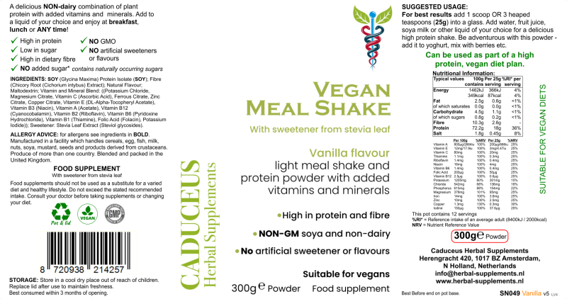 Smakelijk en vullend, Vegan Meal Shake(vanillearoma) zorgt voor de ideale shake tussen maaltijden. Het kan zelfs worden gebruikt als een smakelijk, schuldvrij dessert - slechts 87 calorieën per portie!