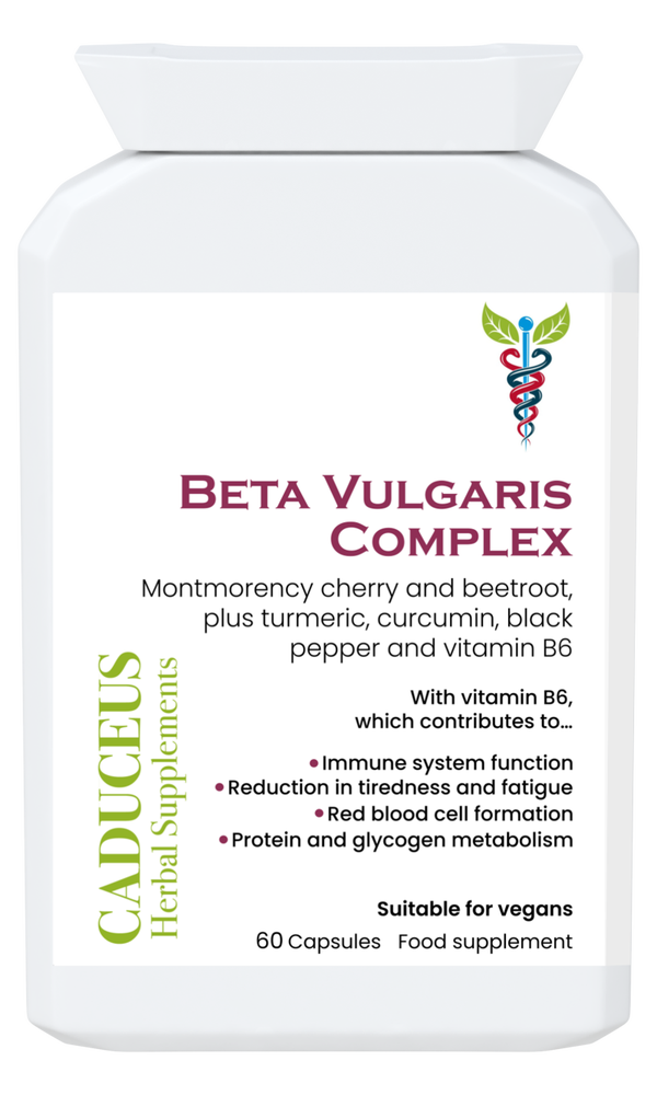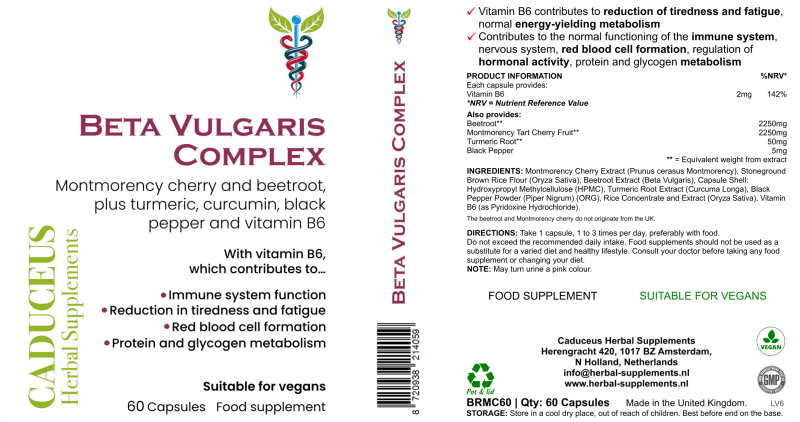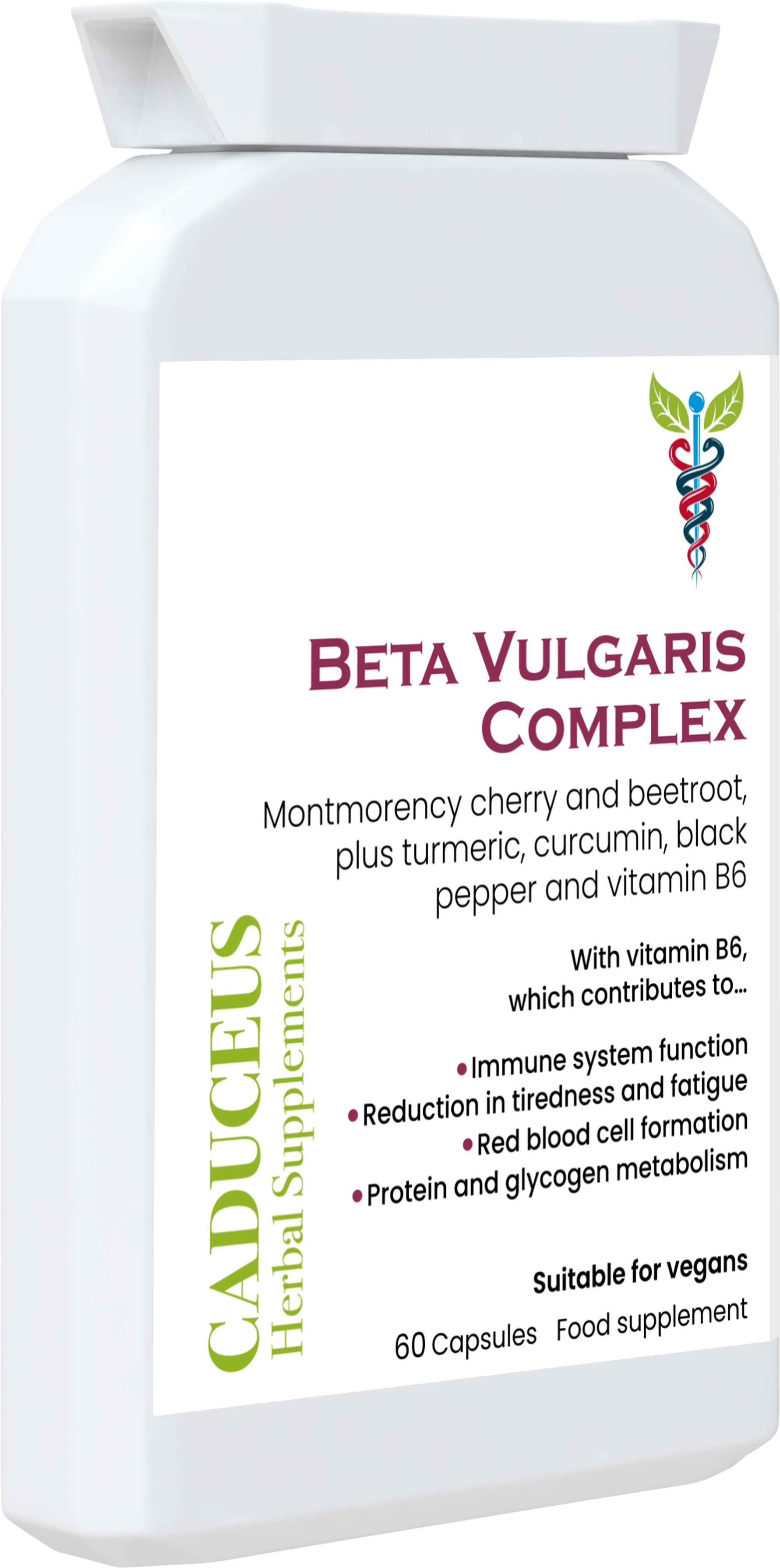 Beta-Vulgaris Complex combineert bietenpoeder en extract (10: 1) met Montmorency (zuur) kersenpoeder en extract (10: 1), om een geconcentreerde formule te geven - 4500 mg per capsule.