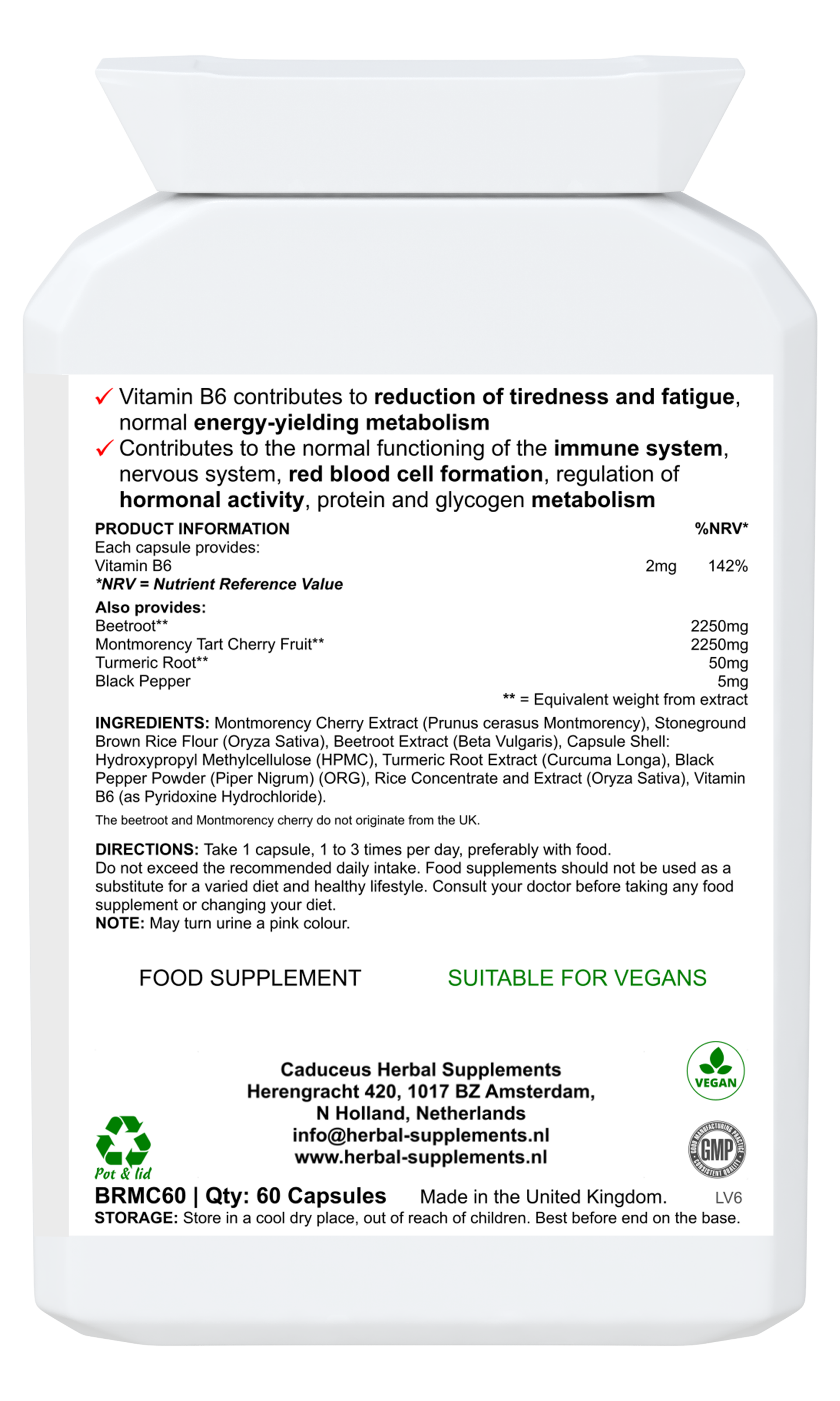 Gecombineerde kersen- en bietencapsules zijn bijzonder populair bij atleten vanwege het hoge gehalte aan nitraat in de voeding in rode biet, de ontstekingsremmende middelen in de Montmorency-kers en het hoge gehalte aan antioxidanten in beide. In combinatie met vitamine B6, zwarte peperpoeder en kurkuma-extract biedt dit supplement degenen die hoge eisen stellen aan hun lichaam een winnende combinatie voor een hoog energieniveau, uithoudingsvermogen, immuniteit en algemeen welzijn.