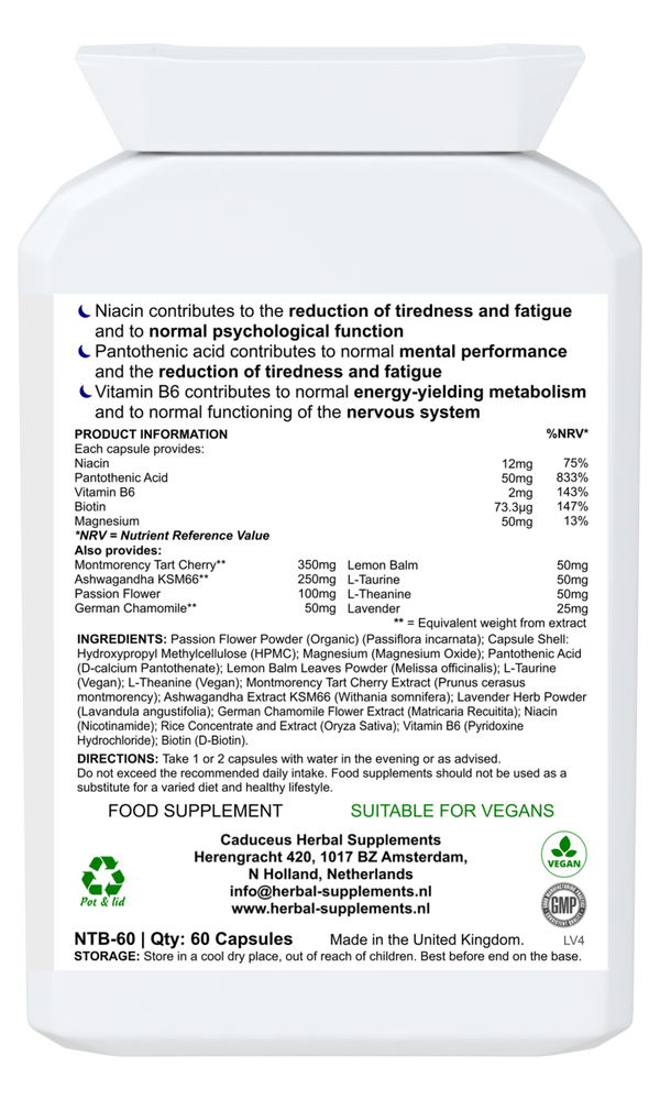 ashwagandha, passiebloem, Duitse kamillebloem, citroenmelisse bladeren en lavendel met L-Taurine, L-Theanine, 5-HTP